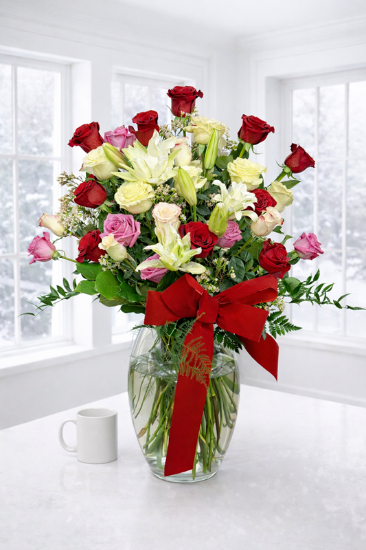 A breathtaking statement of love, Bel Aire Glorious Love features four dozen premium roses artfully arranged around centered, double petal lilies for dramatic impact and elegance. Designed to captivate, this extraordinary arrangement is our ultimate expression of romance bold, luxurious, and unforgettable.