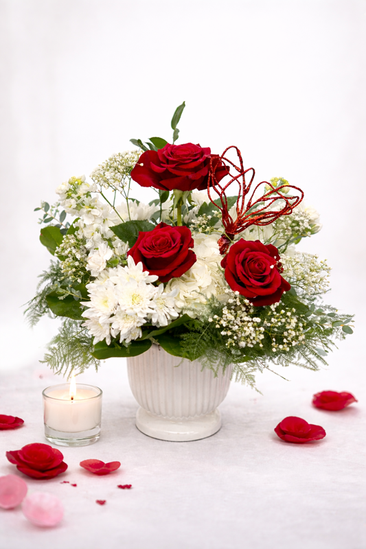 An elegant expression of romance, Champagne Kisses features lush all-white blooms accented with three striking red roses, artfully arranged in a white ribbed ceramic vessel. Soft, refined, and effortlessly chic, this arrangement captures the beauty of understated luxury.