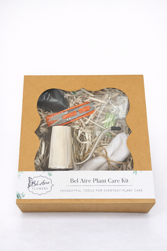 Give your plants the same level of care you give your flowers. The Bel Aire Plant Care Kit is a thoughtfully curated set of essentials designed to keep your plants healthy, vibrant, and thriving long after delivery. Perfect for plant parents of every level, from first-time owners to seasoned green thumbs.
