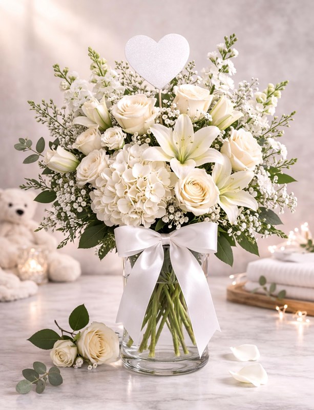 Thoughtfully arranged in a clear glass vase, this refined design is perfect for hospital delivery or welcoming baby home when you want something meaningful yet understated.