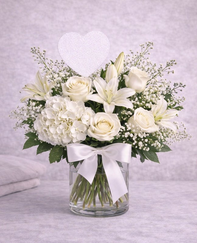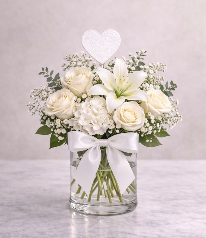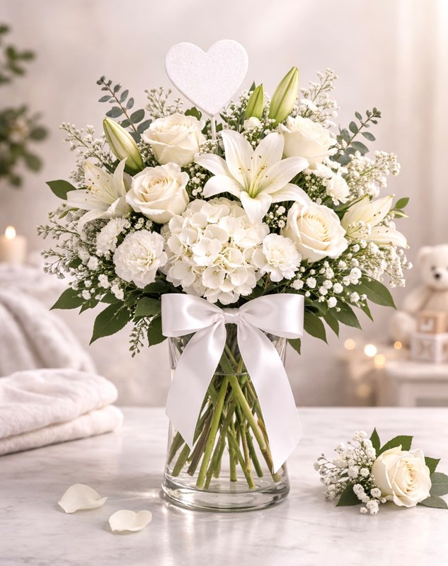 Soft, elegant, and timeless, our pure welcome Hello Baby Arrangement is a beautiful way to celebrate a precious new arrival. Designed in classic all-white tones, this bouquet features fresh white roses, a graceful lily, delicate baby’s breath, and lush greenery, accented with a satin ribbon and simple white heart detail.