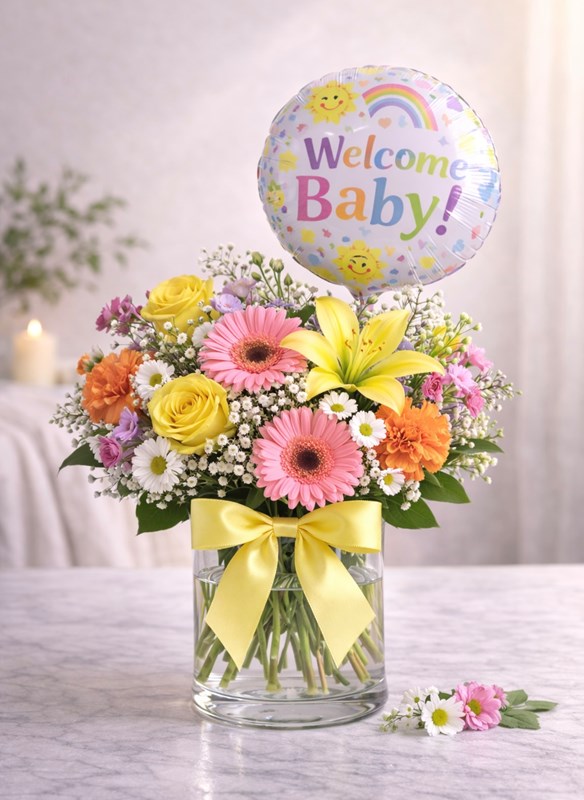 Topped with a festive “Welcome Baby” balloon, this colorful design is perfect when the gender is a surprise or when you simply want to send something full of warmth and celebration.