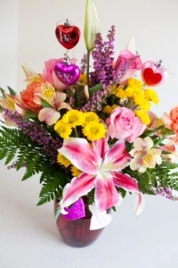 The Bel Aire Color my World Bouquet is one of our specialty bouquets. This arrangement features fragrant liles, alstroemeria, roses, french heather and all the special touches of heart-shaped ornaments with special messages of love. This creatively designed beautiful bouquet will be a hit every time!