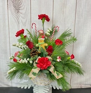 The whimsical Christmas arrangement of your dreams. Filled with holiday goodies, the Gingerbread Man also features red roses, red carnations and winter greens.